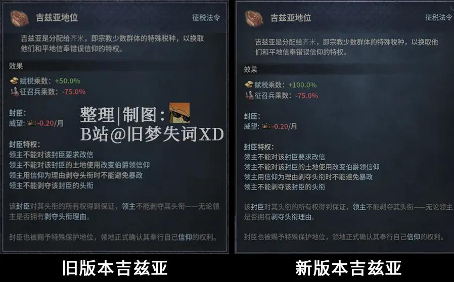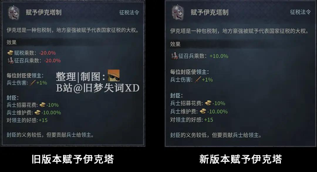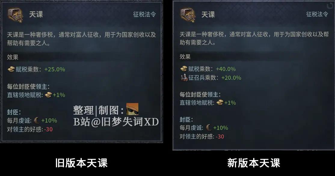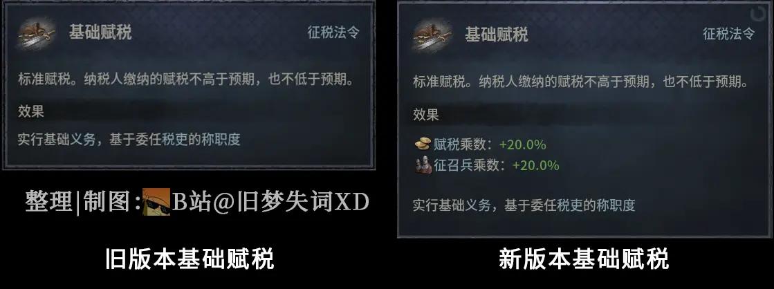 我們將新舊徵稅法案一對比,不難發現都得到了不少的加強,基礎賦稅直接提高20%的賦稅和徵召兵乘數。