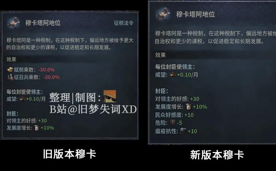 穆卡塔阿則有原來各30%的懲罰,改爲每位封臣使領主0.1每月威望加成。同時還提高了封臣的民衆,危險和抗疫能力。