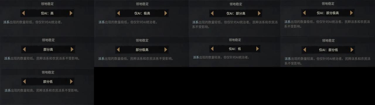 根據玩家社區反饋,我們在領地穩定遊戲規則中添加了幾個新選項——還有一些額外的選項!現在,您可以將穩定設置爲僅影響AI,並且還有一個額外的設置可以避免改變農民和民粹派系的頻率,因爲根據您的設置,這些派系可能會變得過於頻繁或不頻繁。