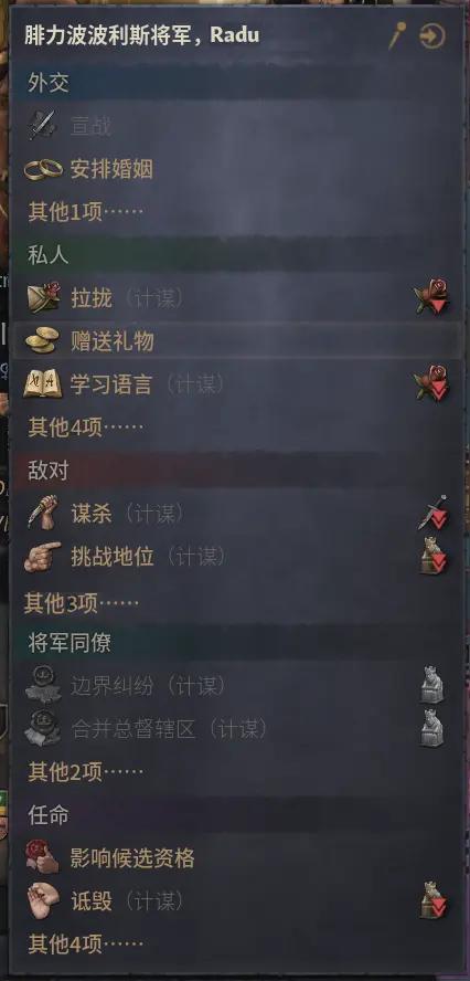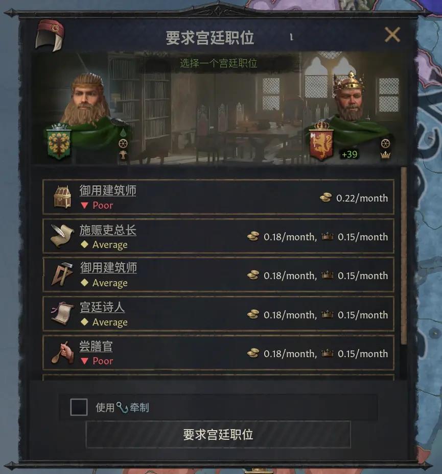 諸多過往缺乏操作途徑的功能現已實現,例如通過宮廷小丑的“取悅廷臣”任務降低除你外他人的壓力。還可利用不同職位逐步提升正統性:總管提供被動緩慢增長,宮廷詩人“寫詩”提供合法性%加成,宮廷樂師(公爵級即可解鎖,且不再僅限「皇家宮廷」DLC)“增強正統性”等。需注意,所有提升屬性點的任務(如“與統治者鍛鍊”)設有平衡機制——僅當任職者相關技能高於玩家時,玩家纔可由此獲得技能。