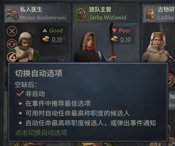 鑑於職位空缺的影響加大,我們新增了三種任由玩家自行選擇的自動任命模式:事件在優秀廷臣中選擇、自動任命最高資質的廷臣、自動分配(並在無合適人選時事件通知)。每個職位都可獨立設置任命模式。