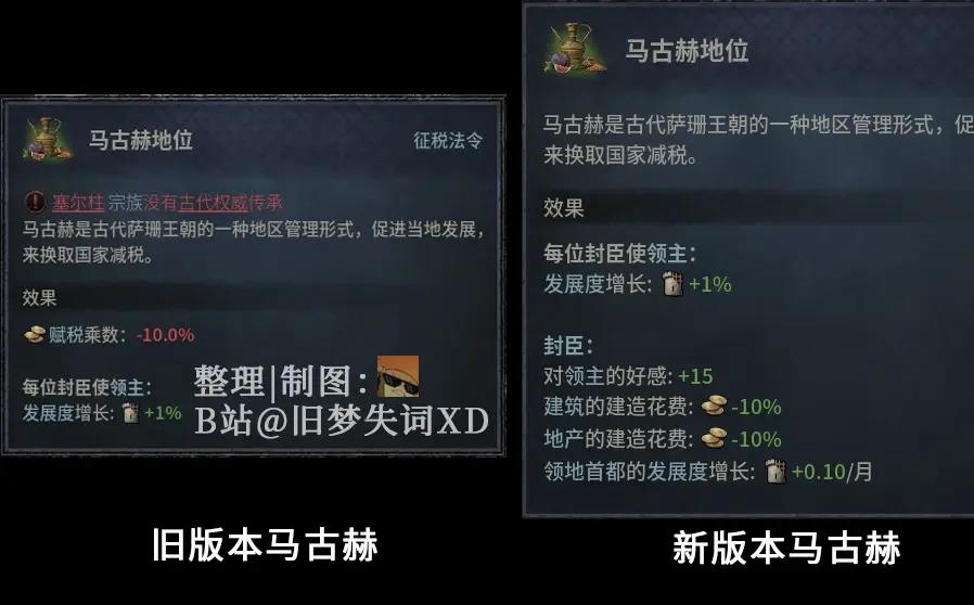 馬古赫從減10%的賦稅乘數改爲每位封臣提高領主1%的發展度增長,同時封臣對領主的好感提高15,以及建築赫地產建造花費減10%優惠,以及領地首都的發展度每月加0.1的增長。