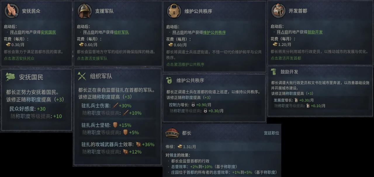 配合宮廷職位重製,行政制獨立統治者新增“都長”職位。都長專注多維度提升首都發展,其任務成本高昂但效果顯著。該職位提供不小的影響力加成,因此對封臣極具吸引力……
