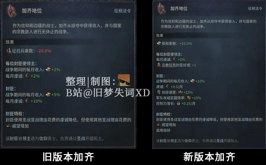 加齊由減20%的徵召兵乘數改爲10%的賦稅提升,同時,封臣還多出了15%劫掠速度、15%軍隊攻城武器效率和每月0.25的控制力增長。