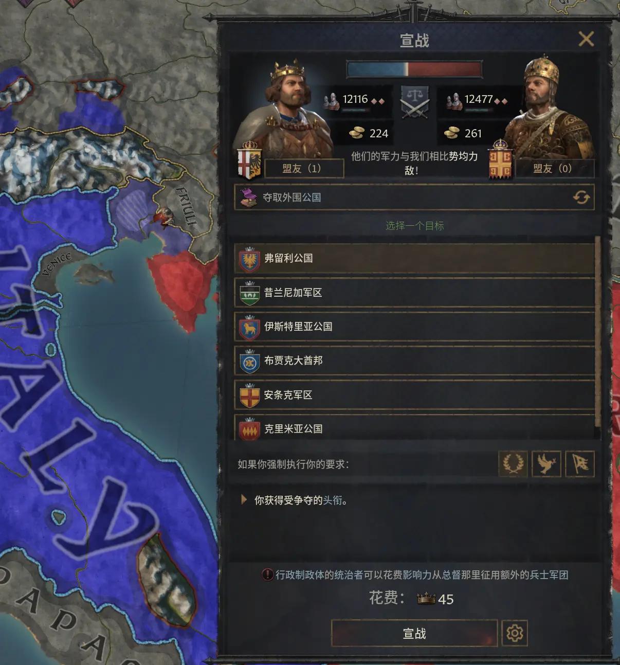 行政制並非全面加強——我們認爲其陷入內戰或變得衰弱,其也太容易保住自己的土地了。新增專屬宣戰理由“奪取外圍公國”,允許以極低威望奪取帝國法理外的任何公國。該CB爲進攻方提供3倍圍城/戰鬥得分,並加速戰爭分數積累,是從多線作戰的帝國手中收復失地的完美手段。