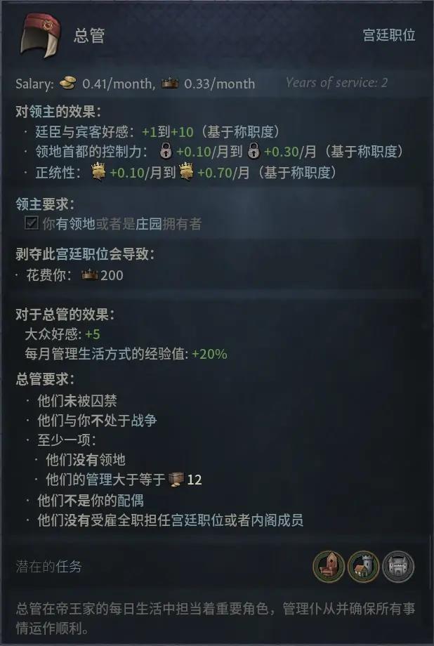 多數職位現爲任職者提供獨特增益效果,例如圖中展示的20%管理經驗加成。這也意味着有更多職位可供封臣出任,此舉意義重大。
