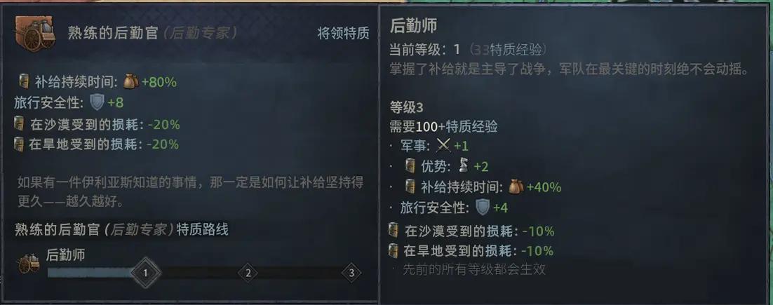 特質升級速度受軍事技能影響,高階特質指揮官將成爲珍貴戰略資源。特質升級需要做任何相關的事:要升級“激進的進攻者”需要贏得進攻戰鬥,要升級“軍事工程師”需要完成圍攻等等。指揮官的軍事技能越高,升級特質的速度就越快。這也意味着具有高級指揮官特質的指揮官可能非常有價值,因爲取代其積累的戰爭經驗並非易事。