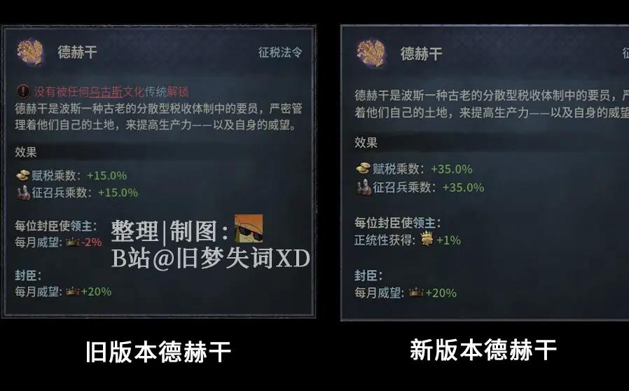 德赫乾的賦稅和徵召兵分別提高了20%,同時對領主的減2%威望改爲每位封臣使領主提高1%正統性。