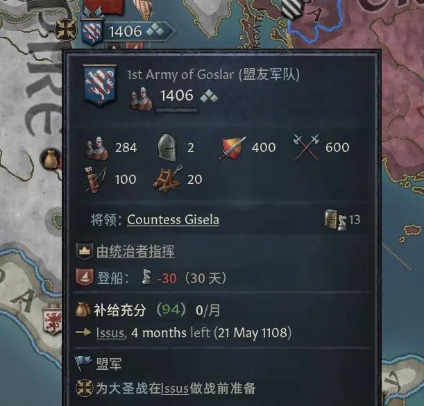 大聖戰第一階段,進攻方AI會尋找補給充足的地區集結全部兵力。由於大量單位分佈在世界各處,他們需要一定的時間來在一個安全的地方集結。如圖所示,針對耶路撒冷的十字軍選擇羅馬周邊作爲集結區,因其既安全又接近目標。盟友AI單位上有一個圖標,包含一段文字解釋他們打算在哪裏集結,這樣玩家就可以尾隨前行。花費數月時間集結後,將進入下一階段:戰備區。