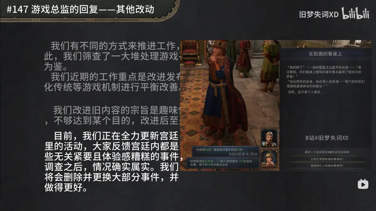 舊夢:我記得ck組去年討論過關於宮廷事件的改進,我覺得這就是一個突破口啊,當玩家在宮廷任職時,能夠主動去觸發這些事件,而不是被動接受這些突發事件。