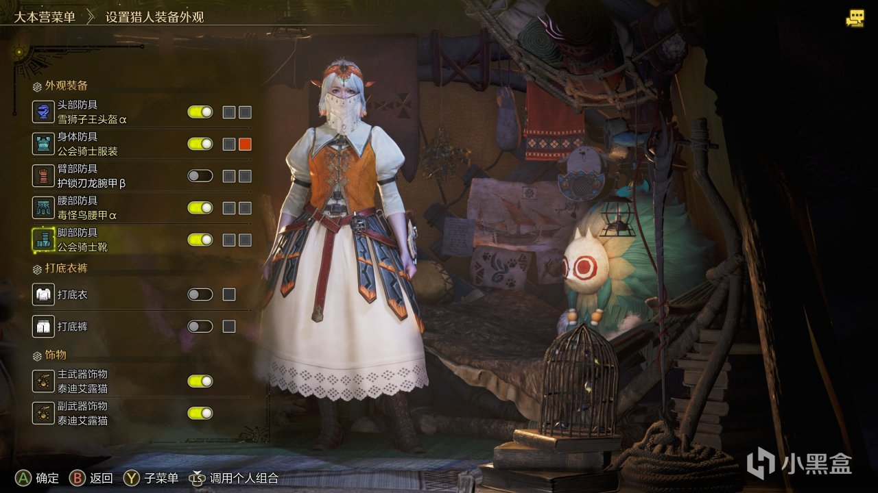面纱好看,可惜上面的橙色染不掉,正好毒怪鸟的裙子挺好看,上面的橙色也染不了,再配上百搭的公会骑士染成橙色,就搭配好啦!臂甲没合适的,直接不穿。