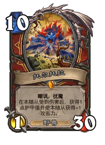 托尔托拉:嘲讽、扰魔、在本随从受到伤害后,获得+1护甲值并使本随从获得+1攻击力