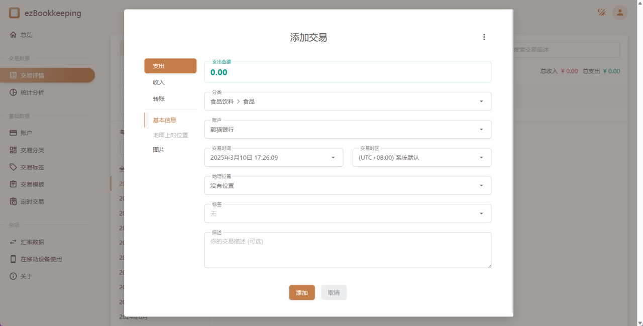 点击交易详情,在这里点击添加就能进行记账管理,交易分为了支出、收入以及转账,甚至还能设置交易的地点以及交易图片信息,用来记录出差发票之类的非常方便,后续直接翻阅就能看到在何处因为什么开的票,方便报销记录。