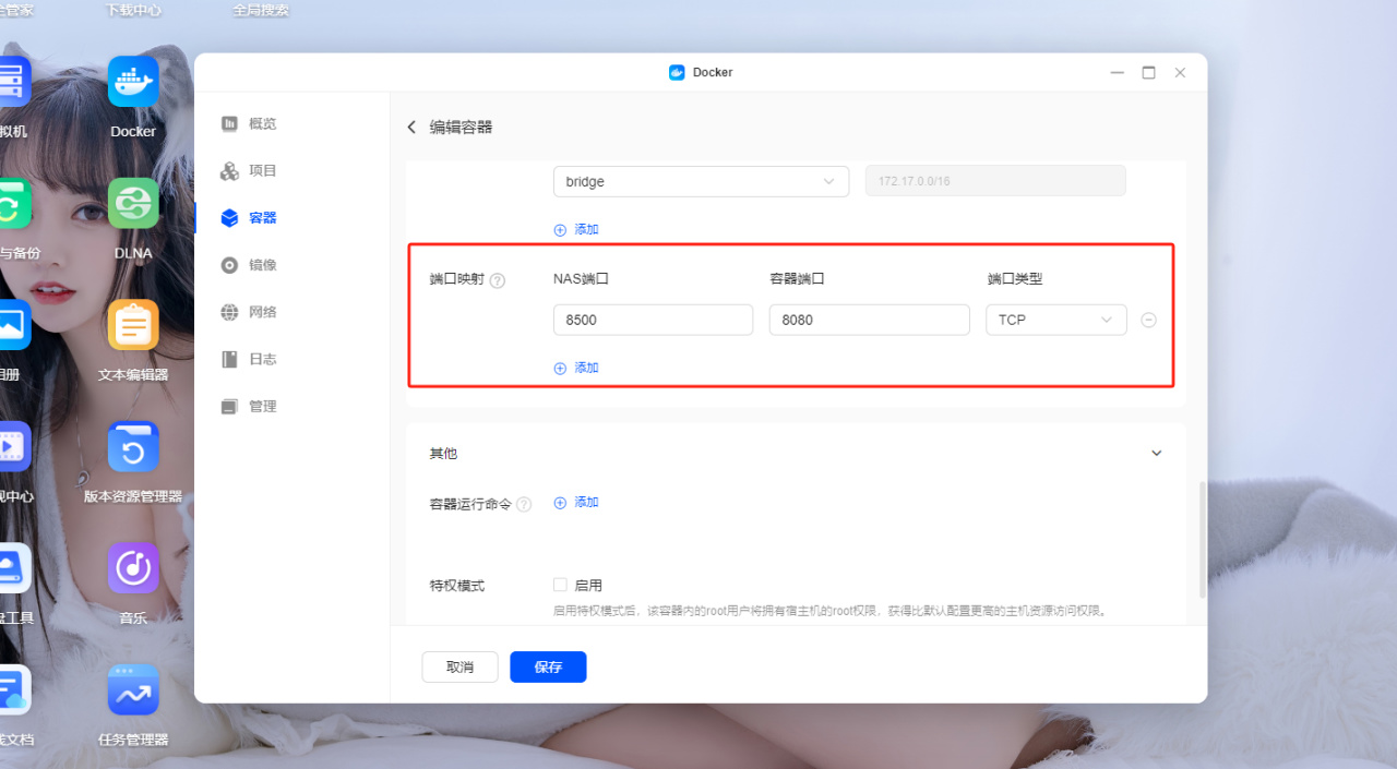 下载之后切换到本地镜像,找到刚刚下载的镜像点击创建容器,这里只需要映射容器端口8080即可,端口记得不要有冲突。