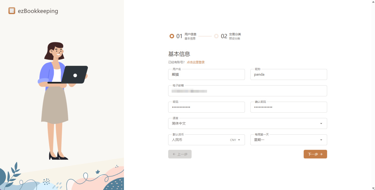 默认情况下是没有账号的,所以首先我们需要创建一个账号,输入用户名、昵称以及邮箱和密码即可,下方能设置默认的货币类型以及每周的起始日,该项目做了深度的汉化,中文支持非常不错。