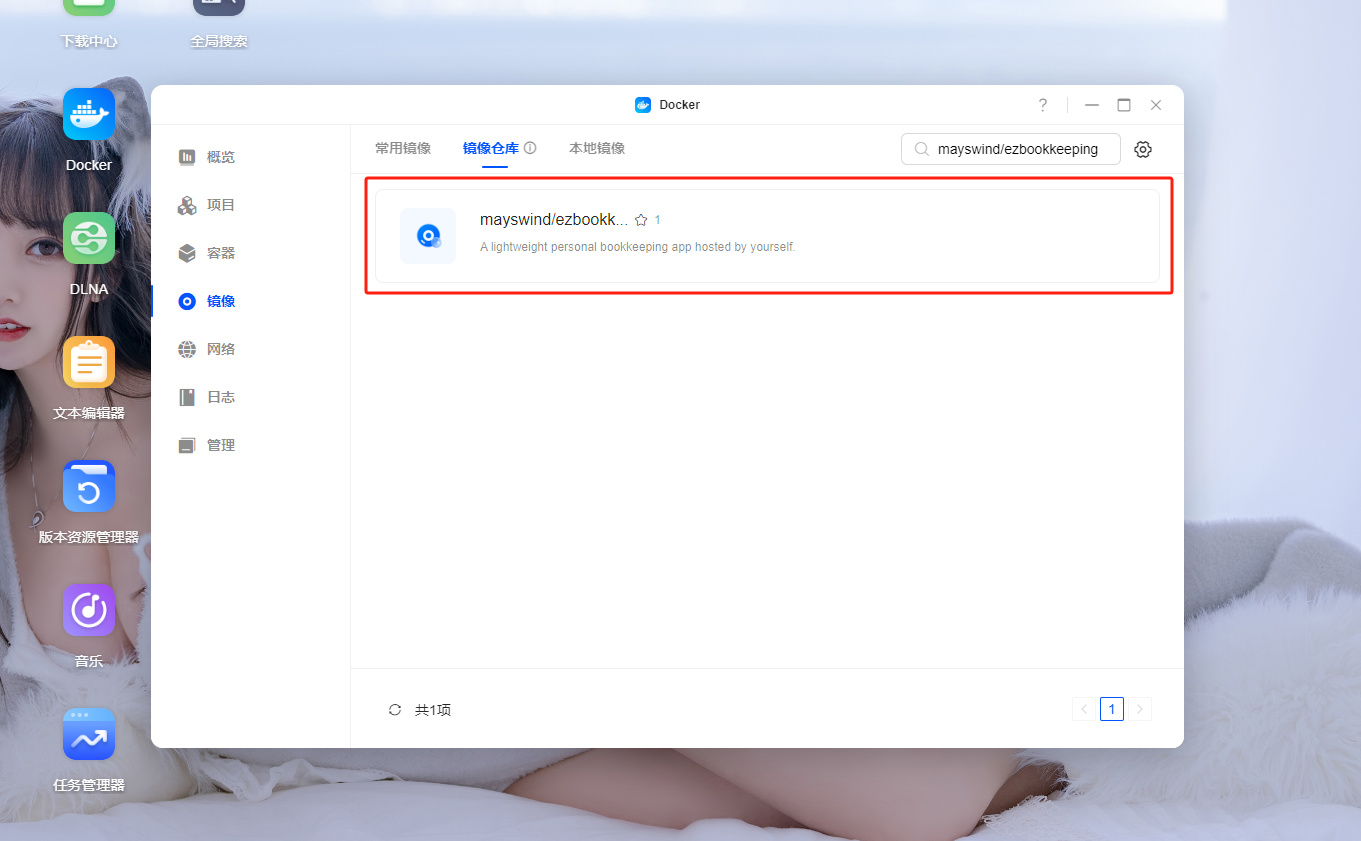 首先我们打开绿联的Docker,来到镜像仓库界面,搜索镜像名mayswind/ezbookkeeping,下载直接默认latest标签即可。