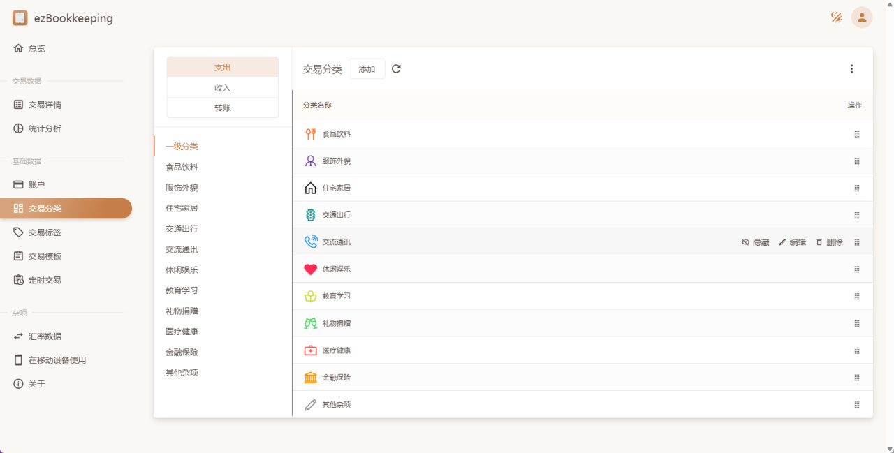 有了账户之后就能进行记账了,如果创建账户时选择了默认的交易分类,那么这时候已经能看到一类交易的分类标签,官方默认的其实已经够用了,不过也支持自行添加更多的分类。