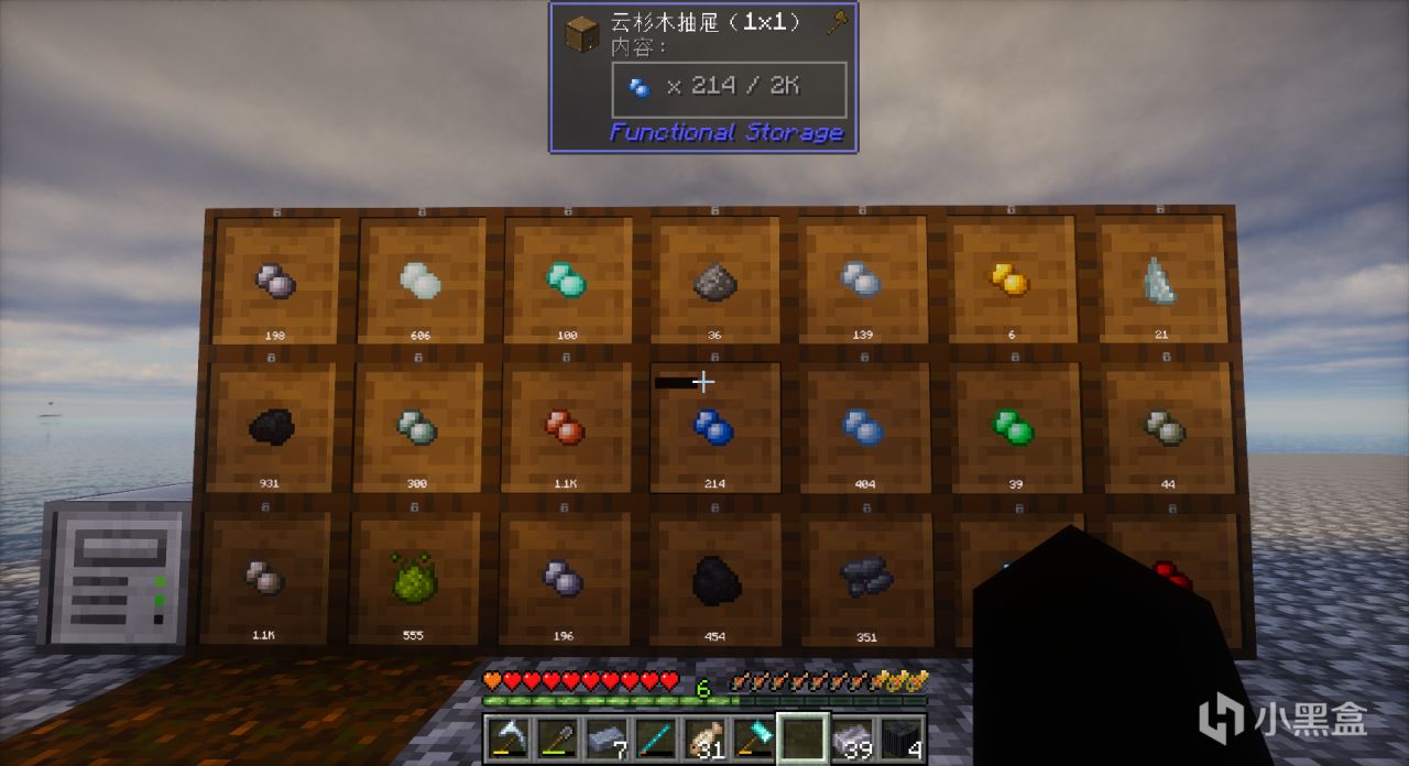 经过升级后,矿物产出量拥有了巨大提升,但是随之而来的就是存储问题。我们选择建造“抽屉墙”来应对前期的存储。因为抽屉能够同时实现分类和大容量存储,并且造价便宜。