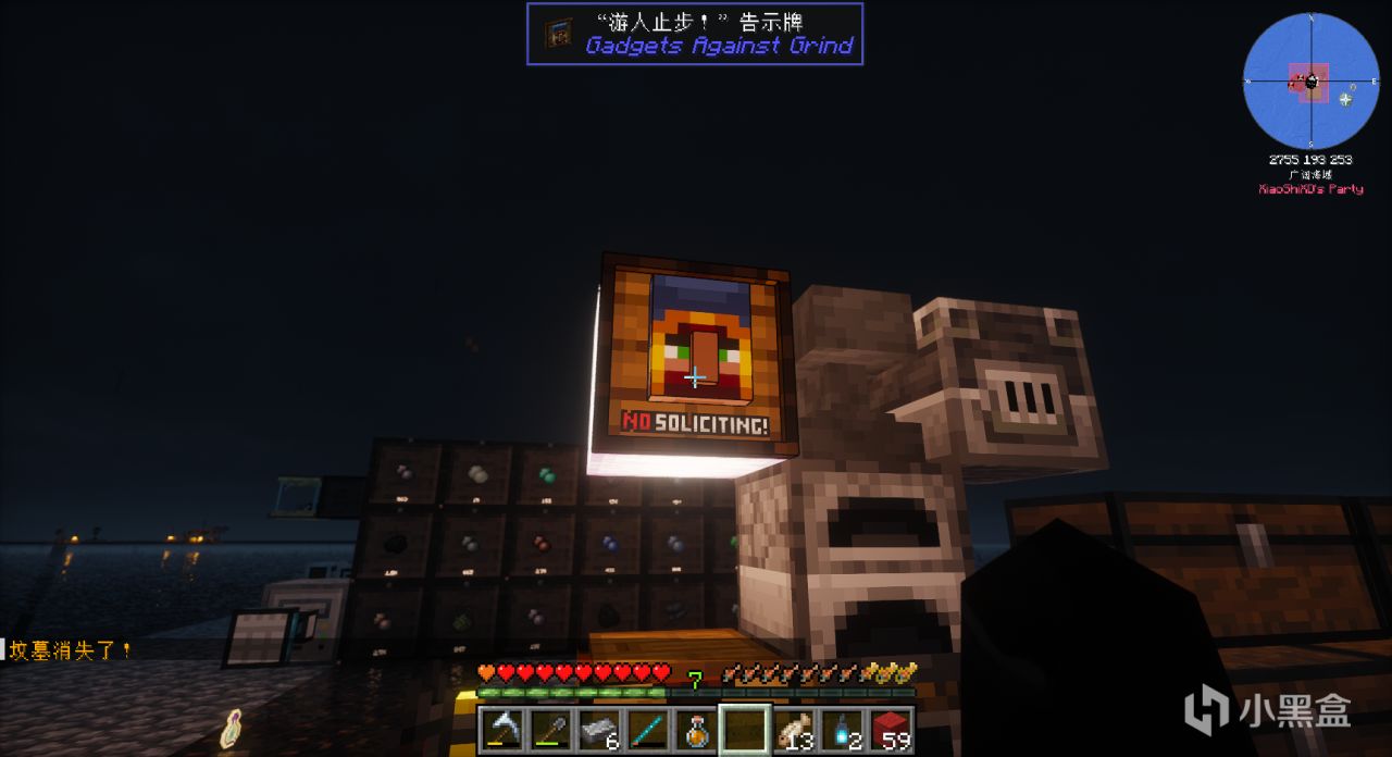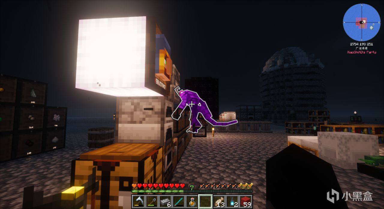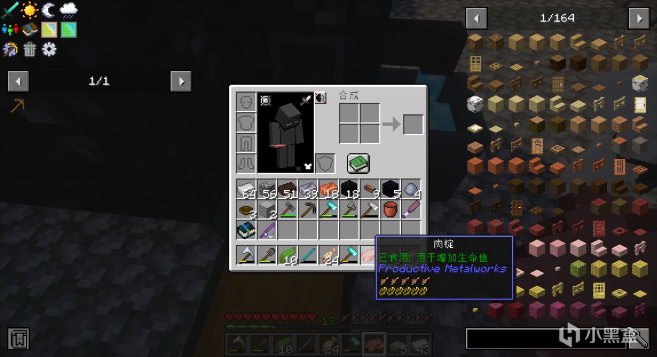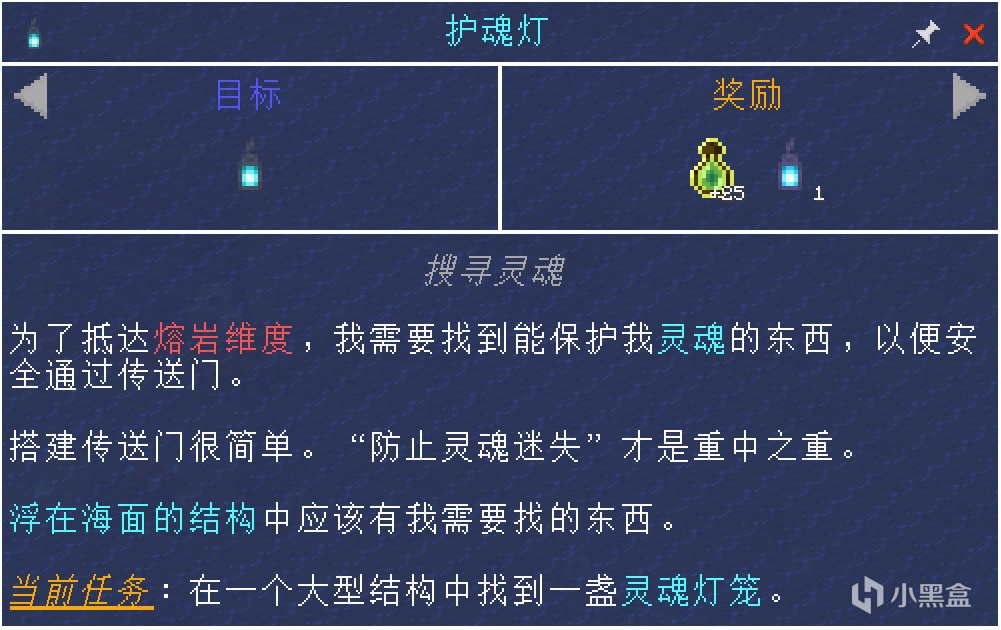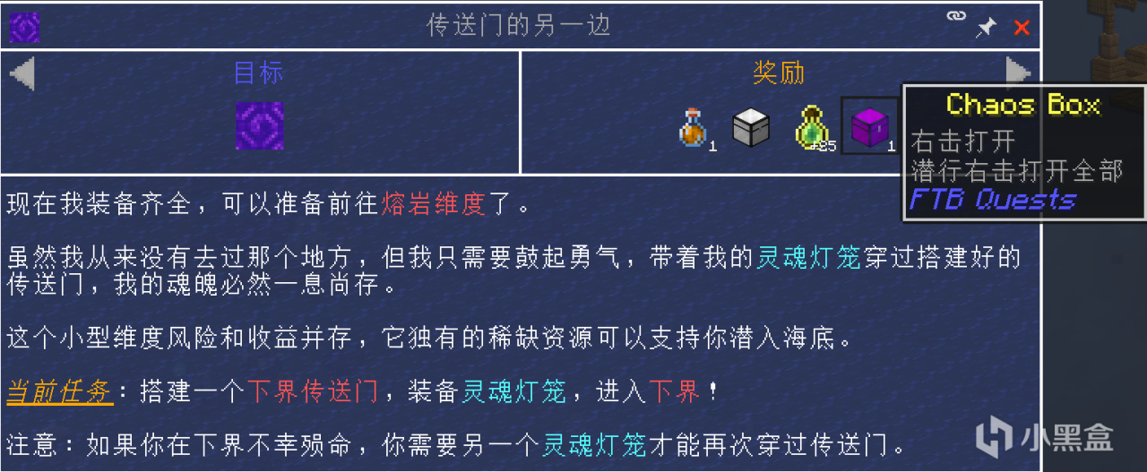 做完这些细枝末节的任务,我们需要进入地狱,“黑曜石”需要的数量少,所以通过“强化玻璃罐”就可以生产一些“黑曜石”,但是在整合包里进入地狱需要一个灵魂灯笼(可以放在腰带和护符的位置)保护我们的灵魂。而灵魂灯笼就在昨天出现的那座遗迹的门前。