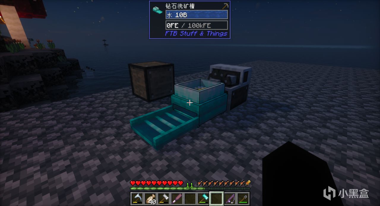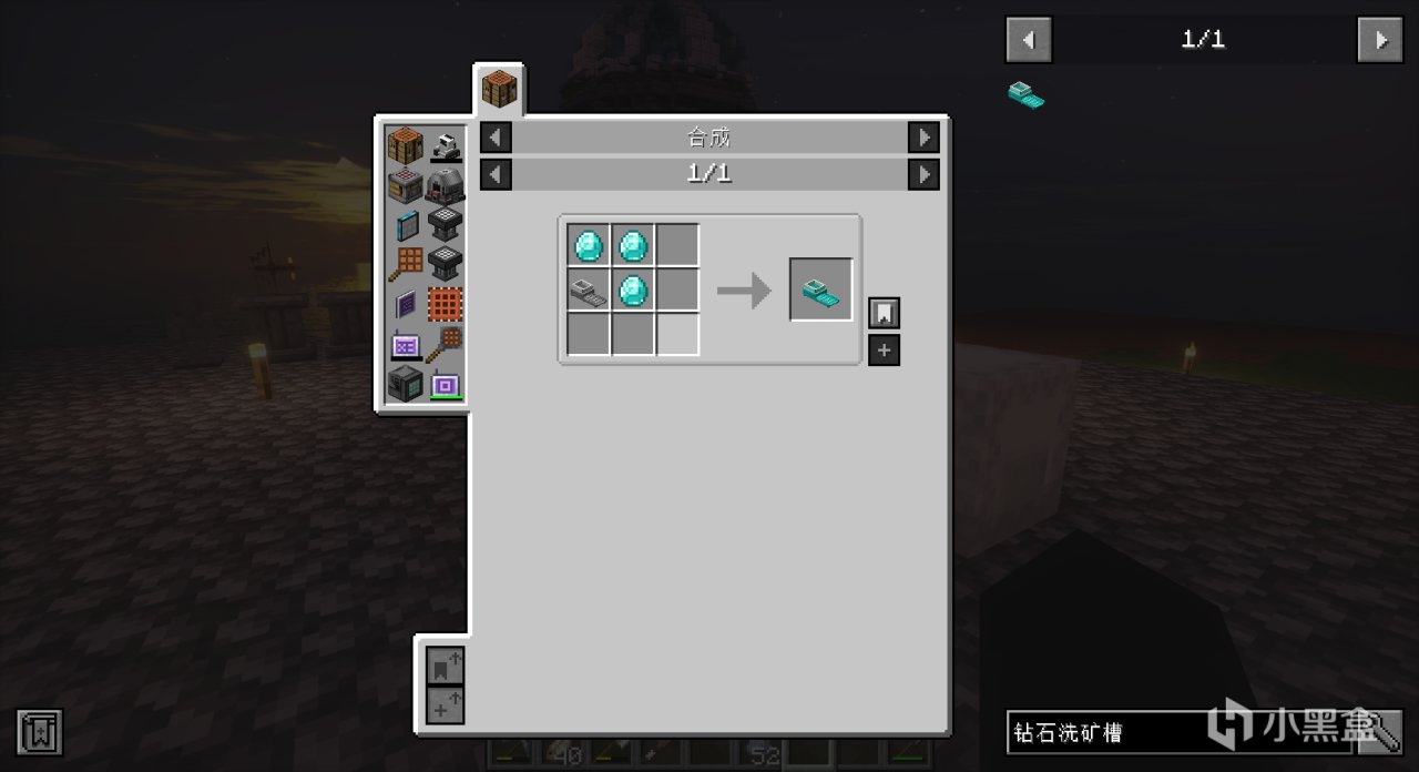 拥有了自动锤意味着我们不用手动锤圆石之类的方块,节省材料也节省了时间,同时能大批量产出需要筛的方块,既然如此,为何不乘此东风扩充矿物产线?为了跟上自动锤的速度,我们先将“铁洗矿槽”升级至“钻石洗矿槽”,加快筛取速度。