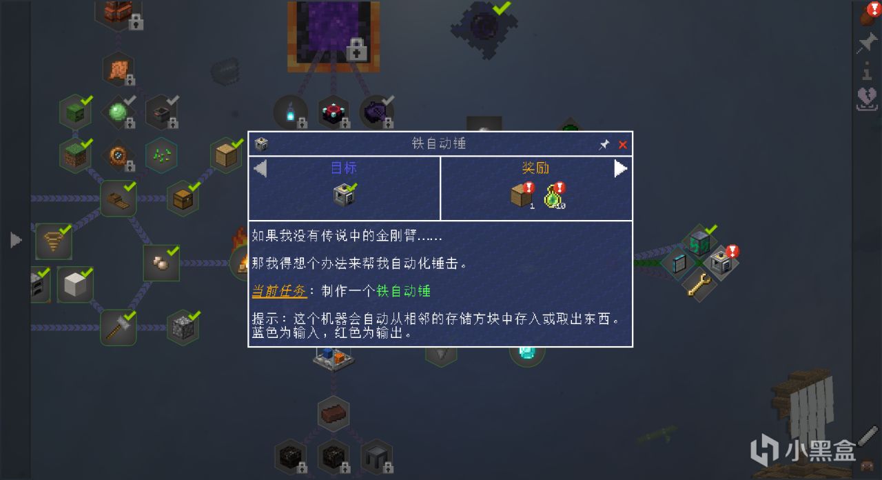 此时有了非常多的矿物存储,接踵而至的是熔炼问题。昨天提到过,在这个整合包里熔炉不能直接熔炼矿物,但是现有的用“强化玻璃罐”烧炼速度又太慢,跟不上矿物产出效率,并且矿物收益也较少,同时根据任务线的提示,“熔炼炉” 。