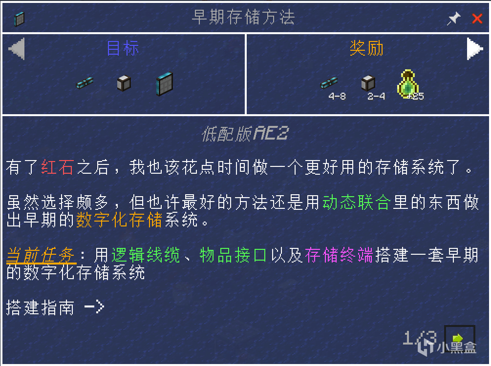 制作出早期的存储系统,弱于ae2,但是胜在便宜(还未正式用上)。