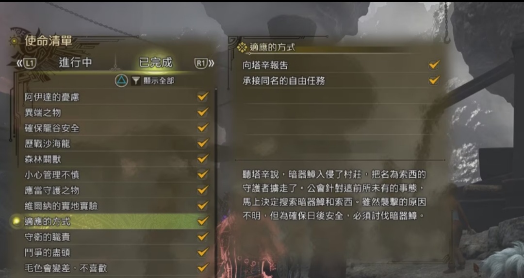 在找素材委託的NPC萊夏之前,必須到守護者村莊找塔辛接取任務“適應的方式”,任務是狩獵一隻暗器鱆。不過,不能直接狩獵野外的暗器鱆,需要找阿爾瑪接取同名的自由任務“適應的方式”。