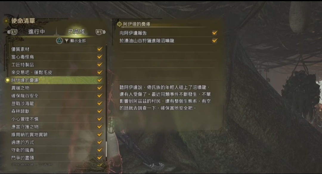 接着去湧油山谷找阿伊達接任務“阿伊達的憂慮”,任務需要在湧油山谷狩獵進階沼噴龍。這個任務可以直接在野外狩獵,也可以通過櫃檯接任務完成。