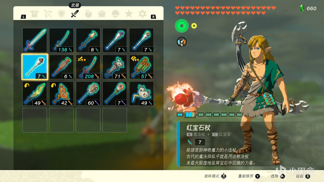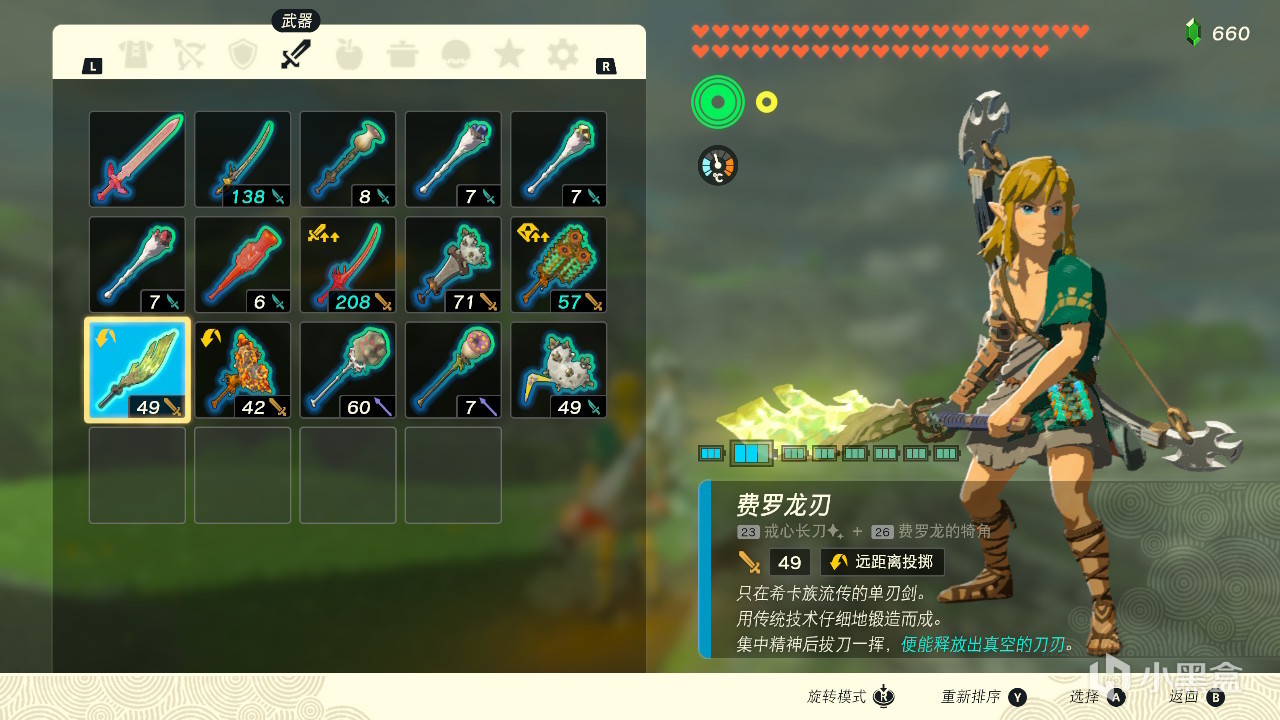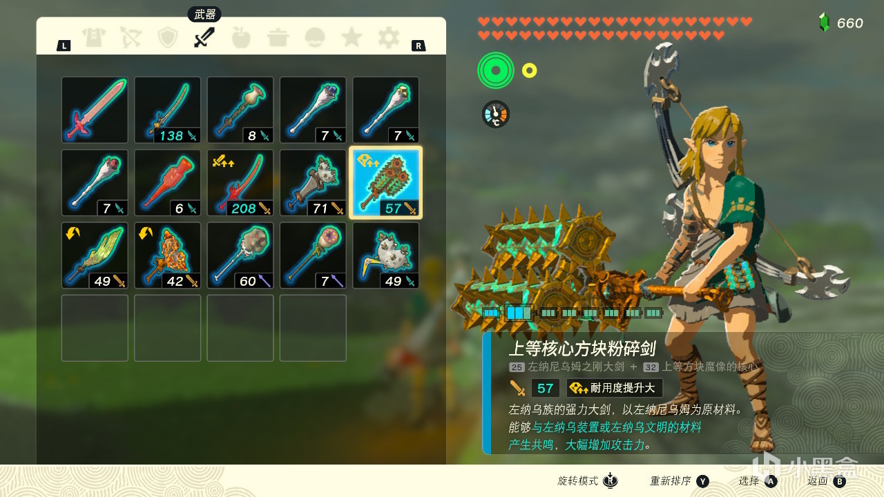 即使王淚中的大師之劍缺少了野炊DLC中開光的神加持,早已風光不再,但不論是出於情懷也好,其它任何理由也罷,我還是想將這一把幾乎可以代表塞爾達傳說整個系列的傳奇武器放在首位。儘管這把大師之劍和任何材料進行餘料建造時都有不俗的表現,但它的耐久度再也無法重現野炊中開光大師劍的輝煌,它的攻擊力也再無法與野炊中高達60點的傲視羣雄相提並論。不過優點還是有的嘛,雖然也是閹割版,它依然可以在等待一段時間後複用。