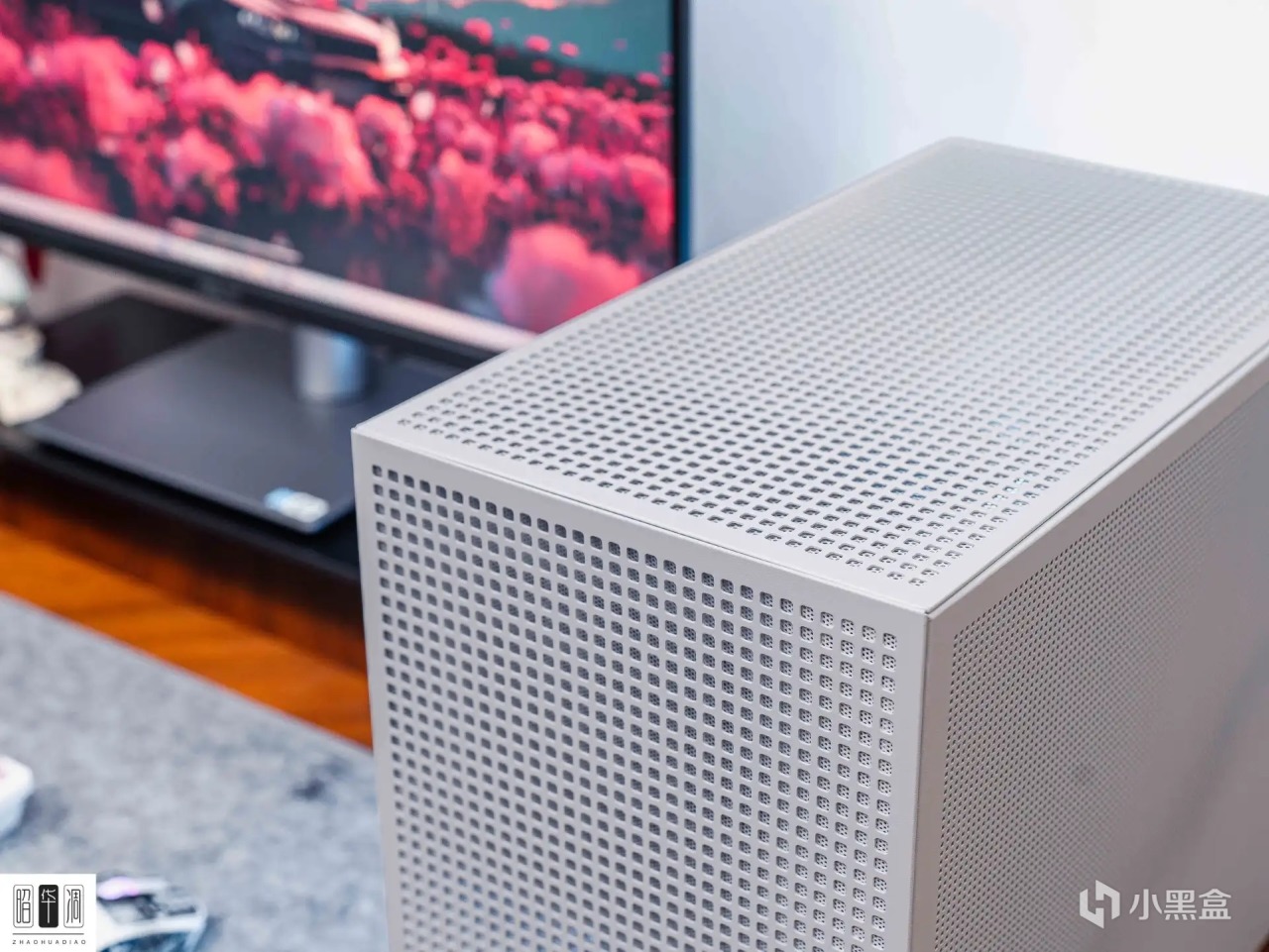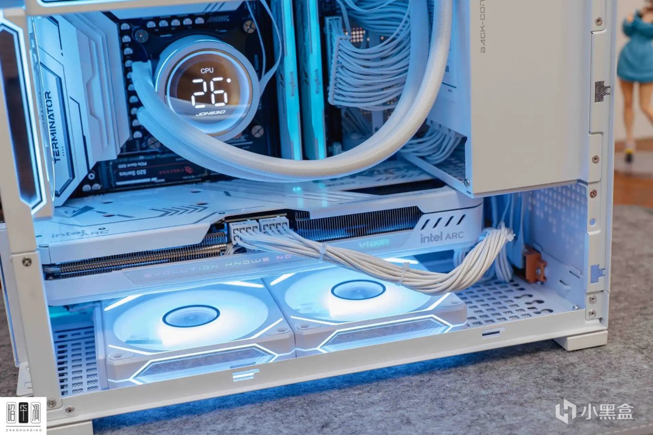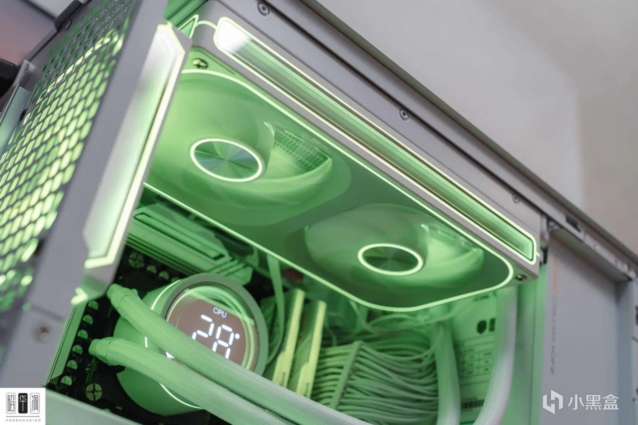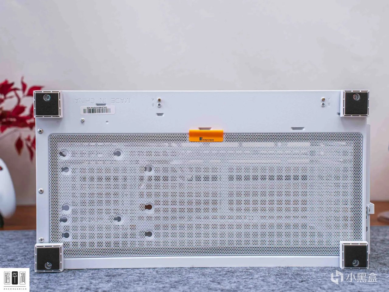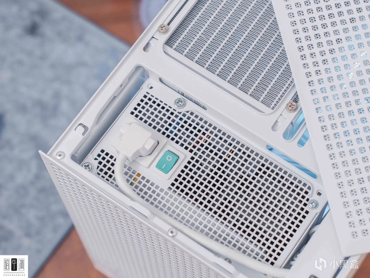 ▼頂部同樣開孔,支持無螺絲快拆快裝,水冷風扇和電源一覽無遺,