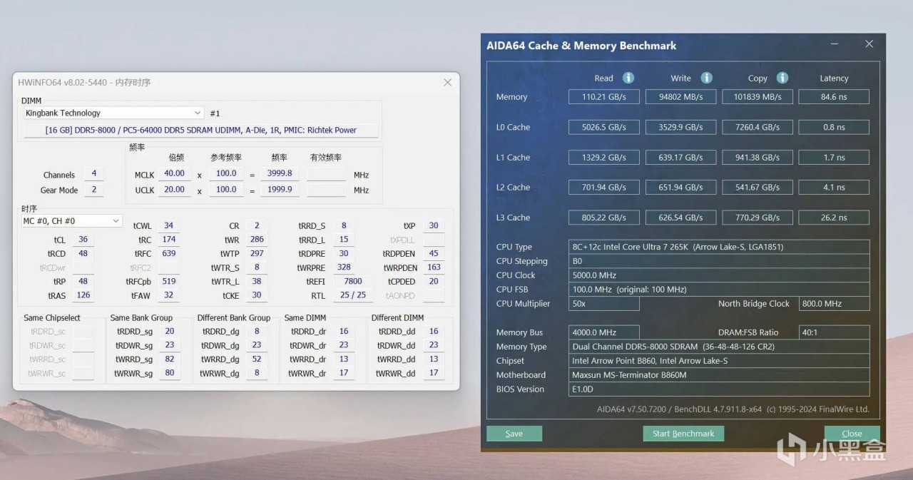 ▼金百達白刃 AIDA64 效能跑分,讀取速度爲 110.21GB/s、 寫入速度爲 94802MB/s、拷貝速度爲 101839MB/s、 延遲爲 84.6ns