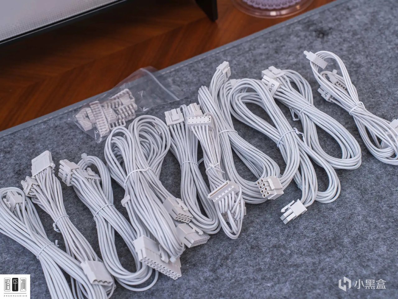 在數量上,除了常規的線材配置外,還特別提供了一根 12V-2×6 顯卡供電線,不僅能提供高達 600W 的電力,還能保證端口完全接觸,以確保硬件安全,綠色特別標示既是提示又有點睛之效。