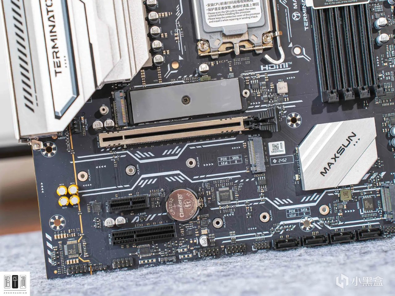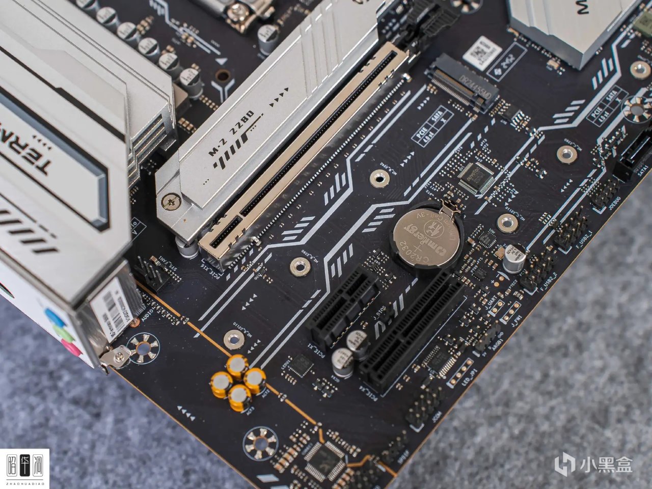 ▼PCIe 插槽主板同樣配備了 3 條。最上方的那條插槽,是專門爲顯卡設計的 PCIe5.0 X 16 插槽,並且配備了合金裝甲,可以爲大型顯卡提供強有力的支撐,防止顯卡因自身重量而出現變形等問題。而下方的兩條插槽,分別爲 PCIe4.0 X 4 插槽和 PCIe4.0 X1 插槽,可以爲各種小型板卡提供安裝位置,進一步豐富了主板的擴展功能,滿足不同用戶對於硬件設備連接的需求。