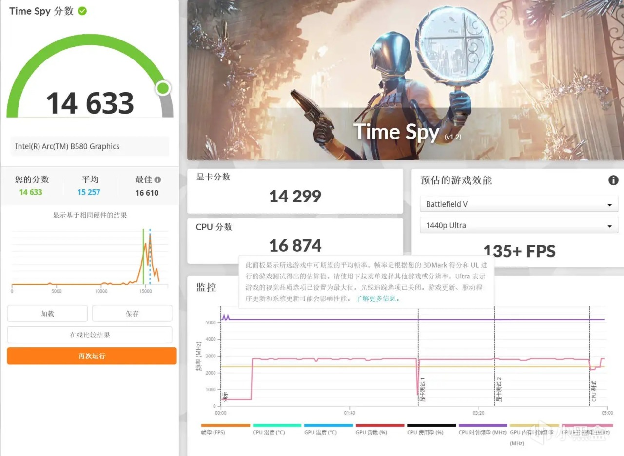 ▼3D Mark Time Spy 性能測試,這也是最能代表顯卡實際遊戲性能的分數,主要反映顯卡在 1080P 分辨率下 DX12 性能。實測下來總得分爲 14633 分,其中顯卡分數 14299分,CPU 分數 16874。