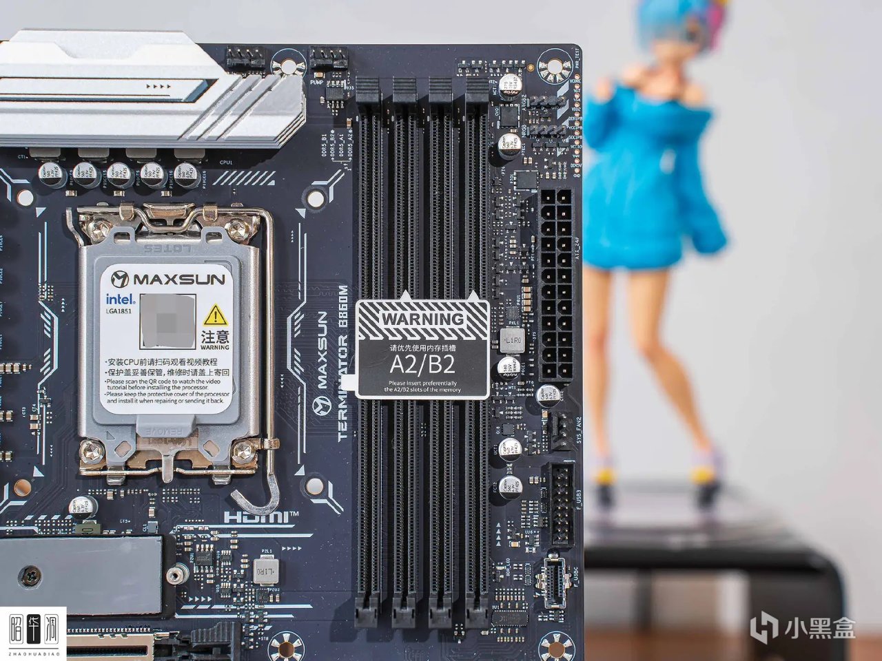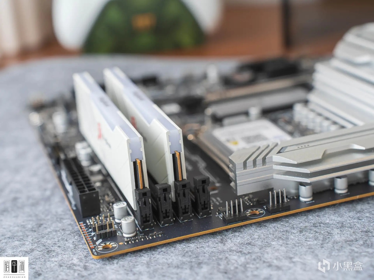 ▼內存方面主板配備 4 條高速 DDR5 插槽,單邊卡扣設計,單個插槽最大支持 64GB,支持 Intel XMP / AMD EXPO 快速超頻技術,配色同步做的到位。這塊主板官方提供的數據是 8800MT/s ,並全面支持頻率更高穩定性更好的 CUDIMM 內存。