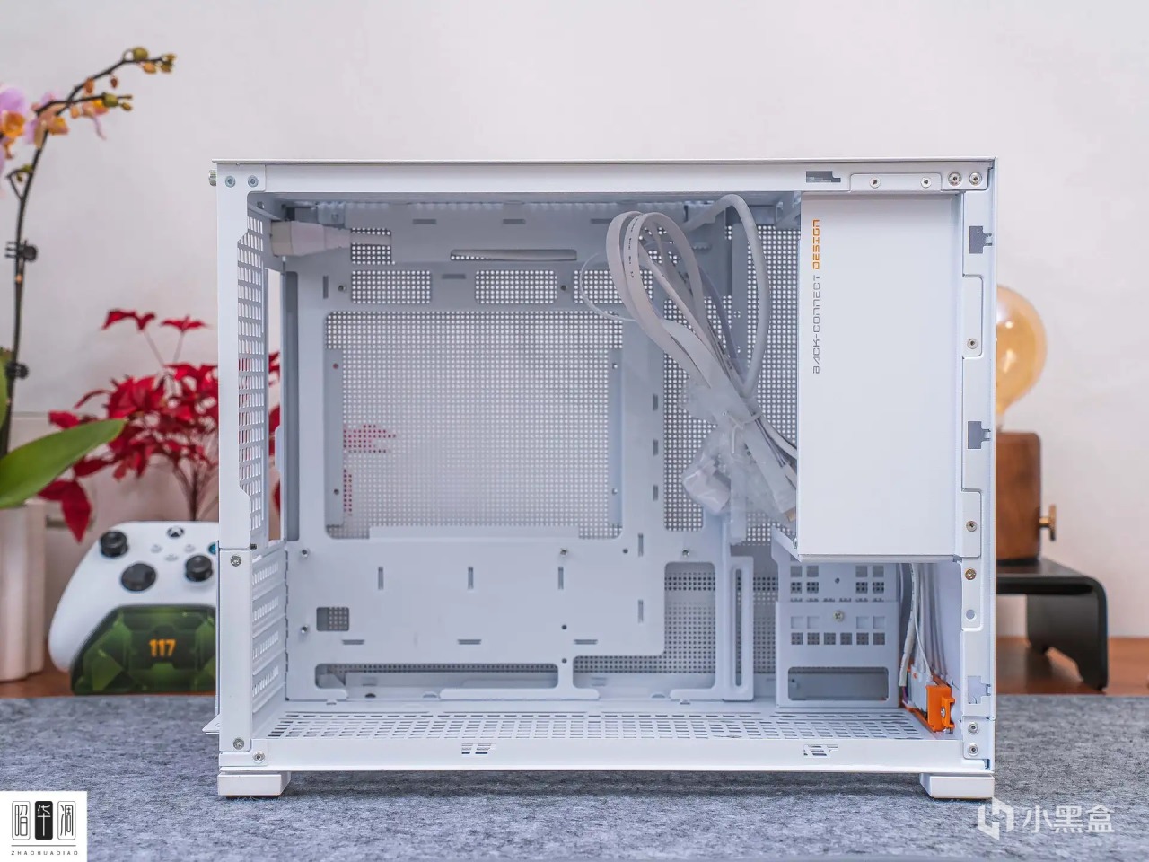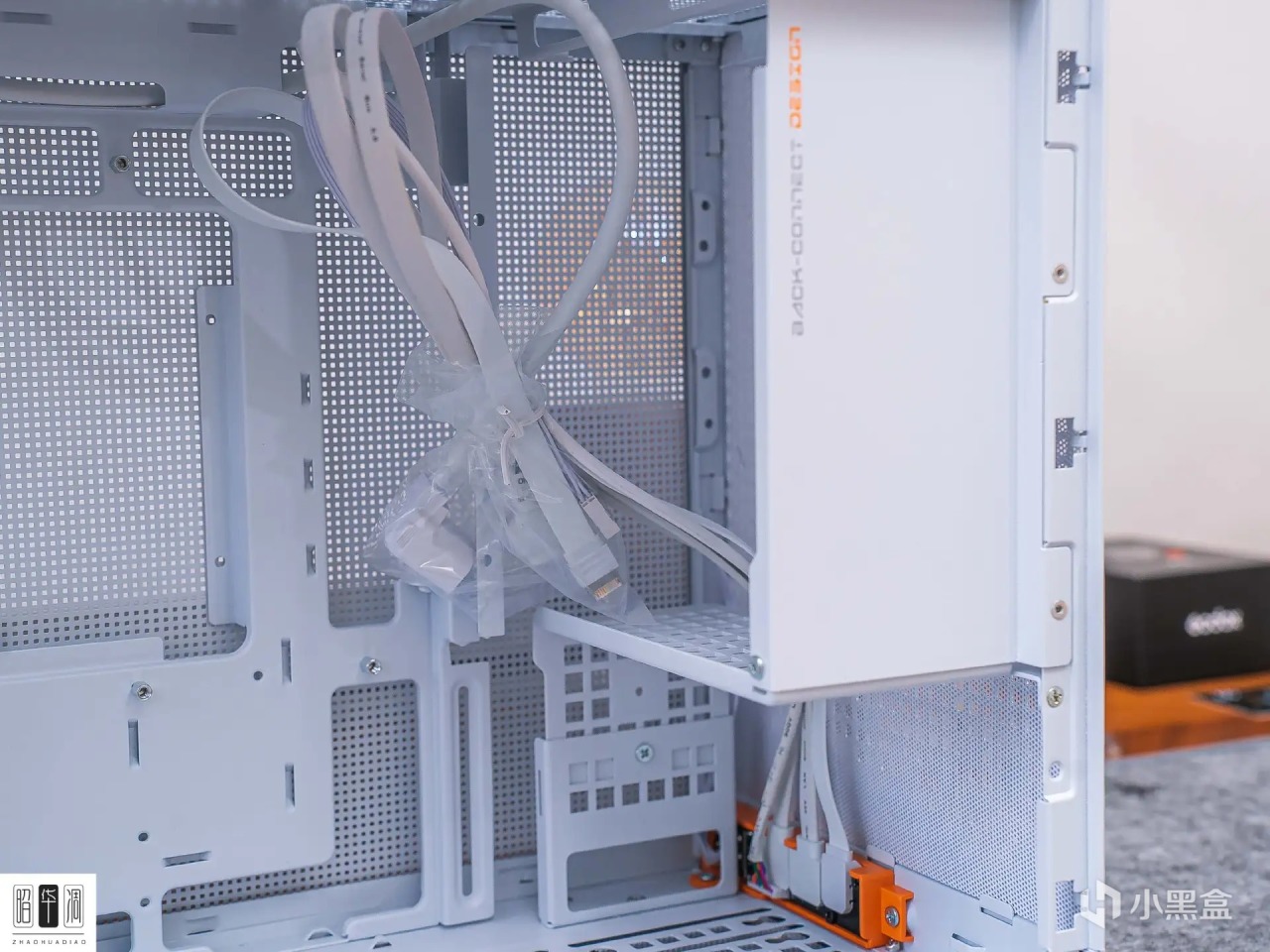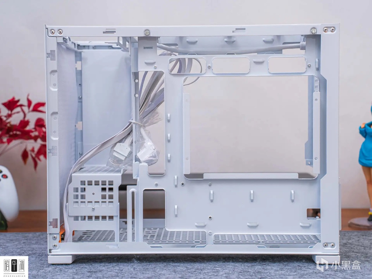 ▼機箱背部視角,可以看到主板安裝位右側和電源安裝位均設計了可調節理線蓋板,完美遮蔽了那些雜亂無章的線材,讓機箱內部瞬間從繁雜凌亂轉變爲簡潔清爽,視覺效果大大提升。