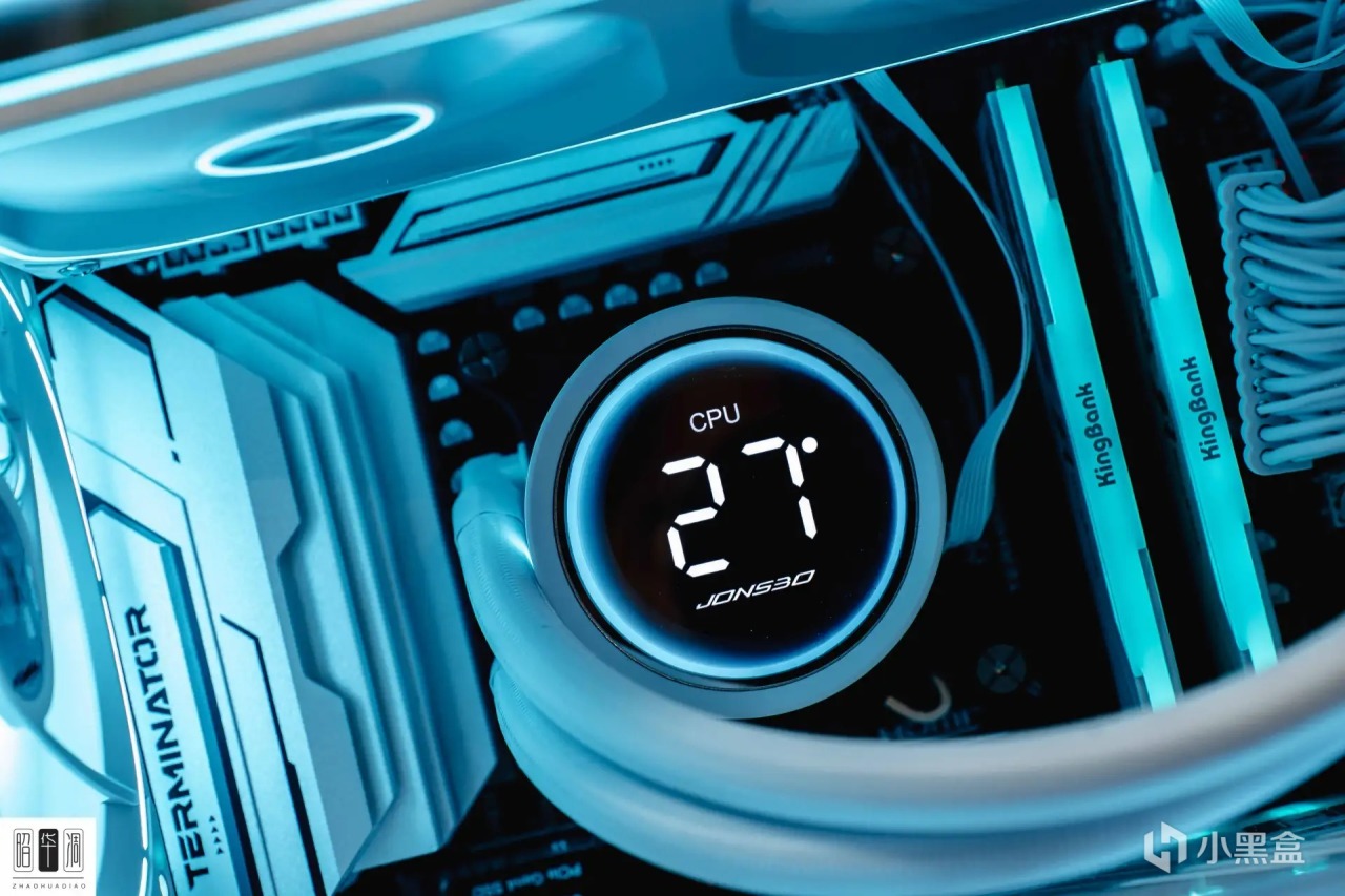 ▼冷頭配備了 一 塊圓形 LCD 數顯屏幕,能顯示 CPU 溫度、CPU使用率、內存佔有率等參數。冷頭側面和頂蓋內帶有千層鏡 RGB 燈效,而且是千層鏡光效,顏值頗高。