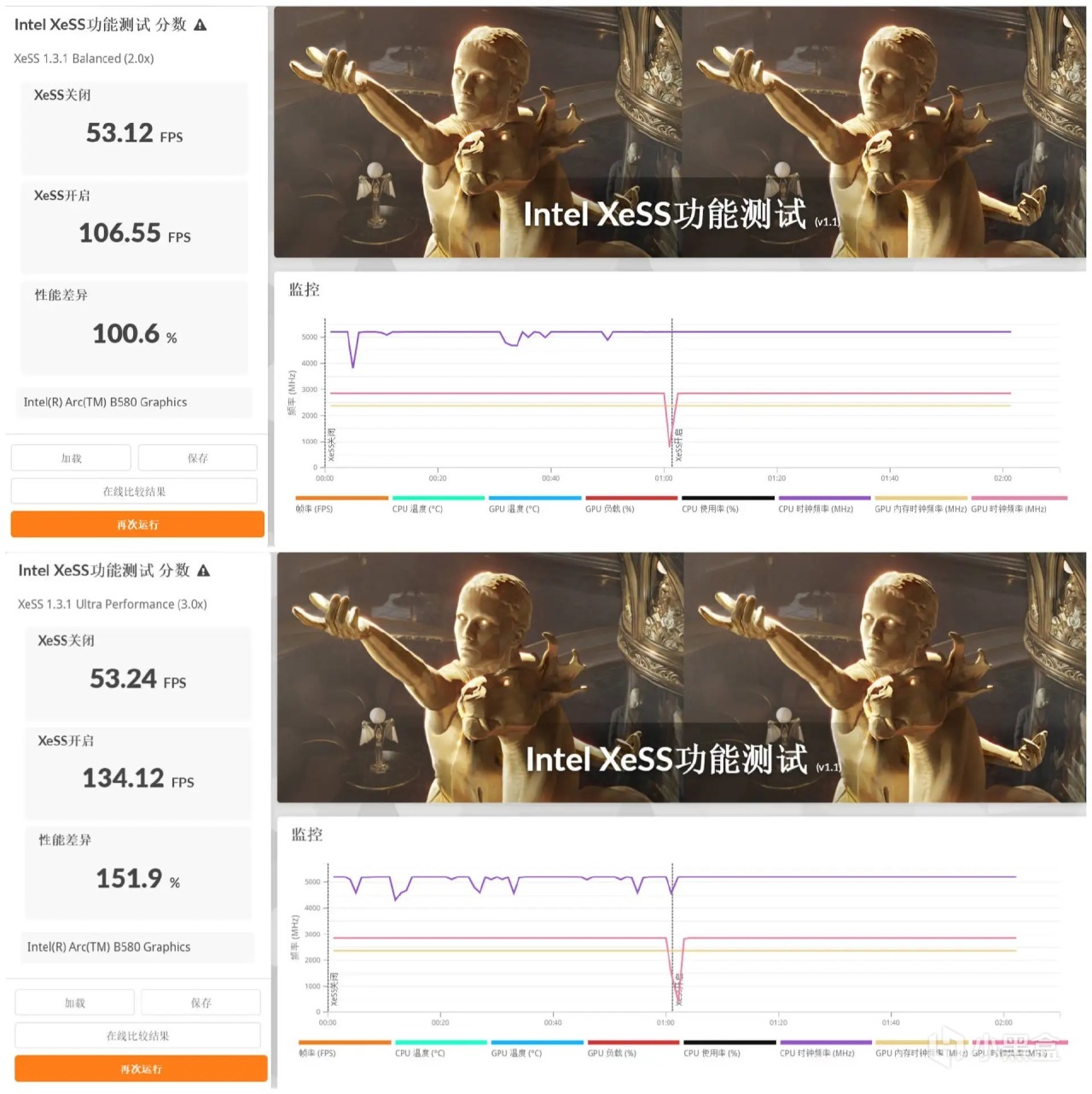 ▼3DMark 針對英特爾 XeSS 提供了專門的測試模組,並提供了多種預設模式,在 1080P 分辨率下質量模式提升 100.6 ,如果切換爲極致性能,提升幅度可以達到 151.9%,增幅可謂相當誇張。