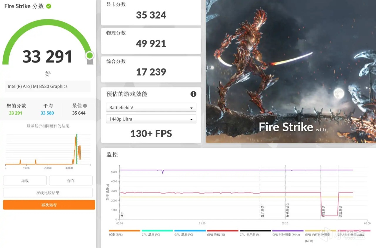 ▼3D Mark Fire Strike,這是一項適用於高性能遊戲電腦和超頻系統的 DirectX 11 基準測試,其統 一 的打分機制對於不同設備的性能比較很有參考。實測下來整機總得分爲 33291分,其中顯卡分數 35324分,物理分數 49921分,綜合得分 17239。