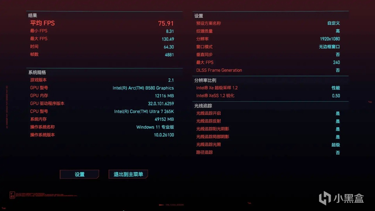 ▼賽博 2077 是少有的同時支持 INA 三家超分辨率技術,在 1080P + 畫質:超級光追 + XeSS性能的設置下,幀率能跑到 75FPS 。