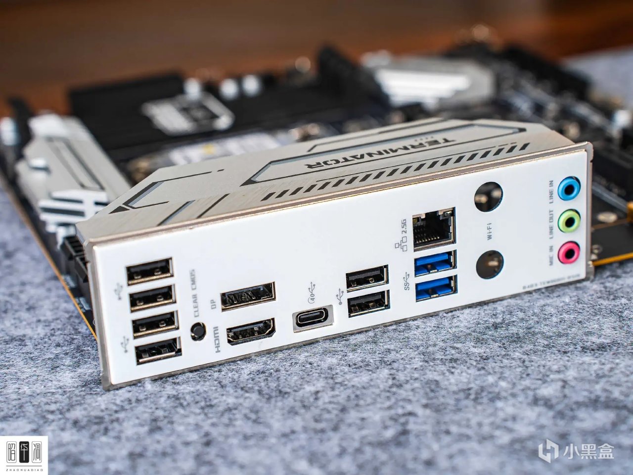 ▼主板左側散熱模塊採用多層堆疊結構設計,中間特意設置了鏤空區域,散熱的同時也有一定裝飾效果。模塊與 MOS 管相接觸的部位,則是高品質的導熱硅條填充,確保導熱過程的高效性。靠近後置 I/O 接口的 一 側採用了金屬拉絲工藝,從視覺上給人以高級感。
