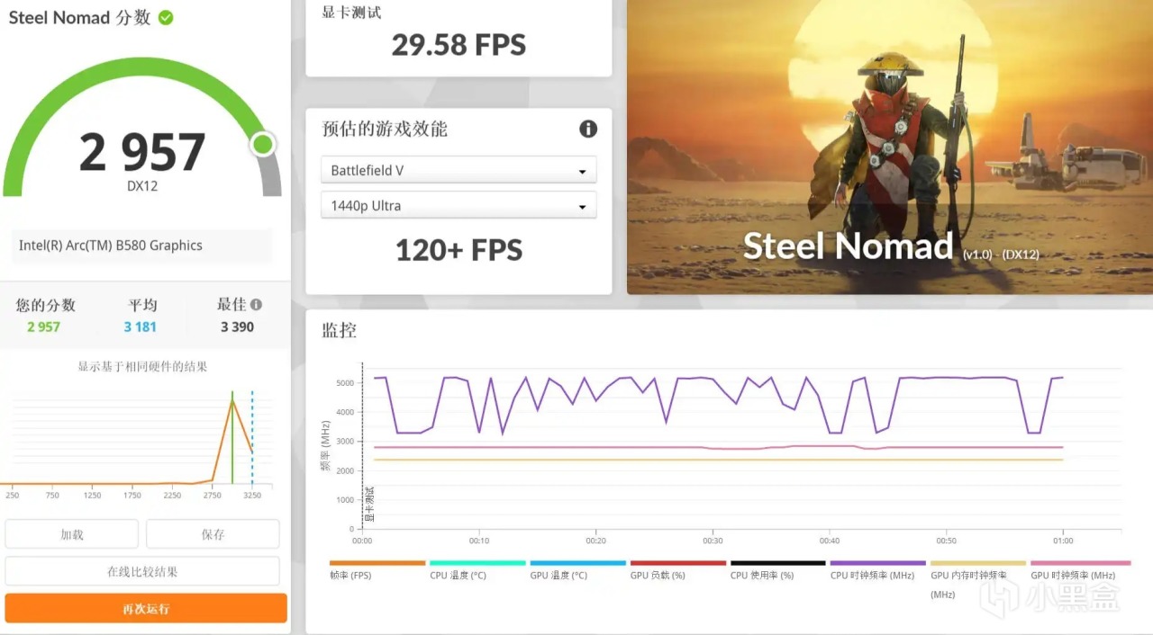 ▼Steel Nomad 主打跨平臺測試,也因爲不支持光追效果,比較容易判斷處理器對顯卡的制約程度,實測下來得分 2957分
