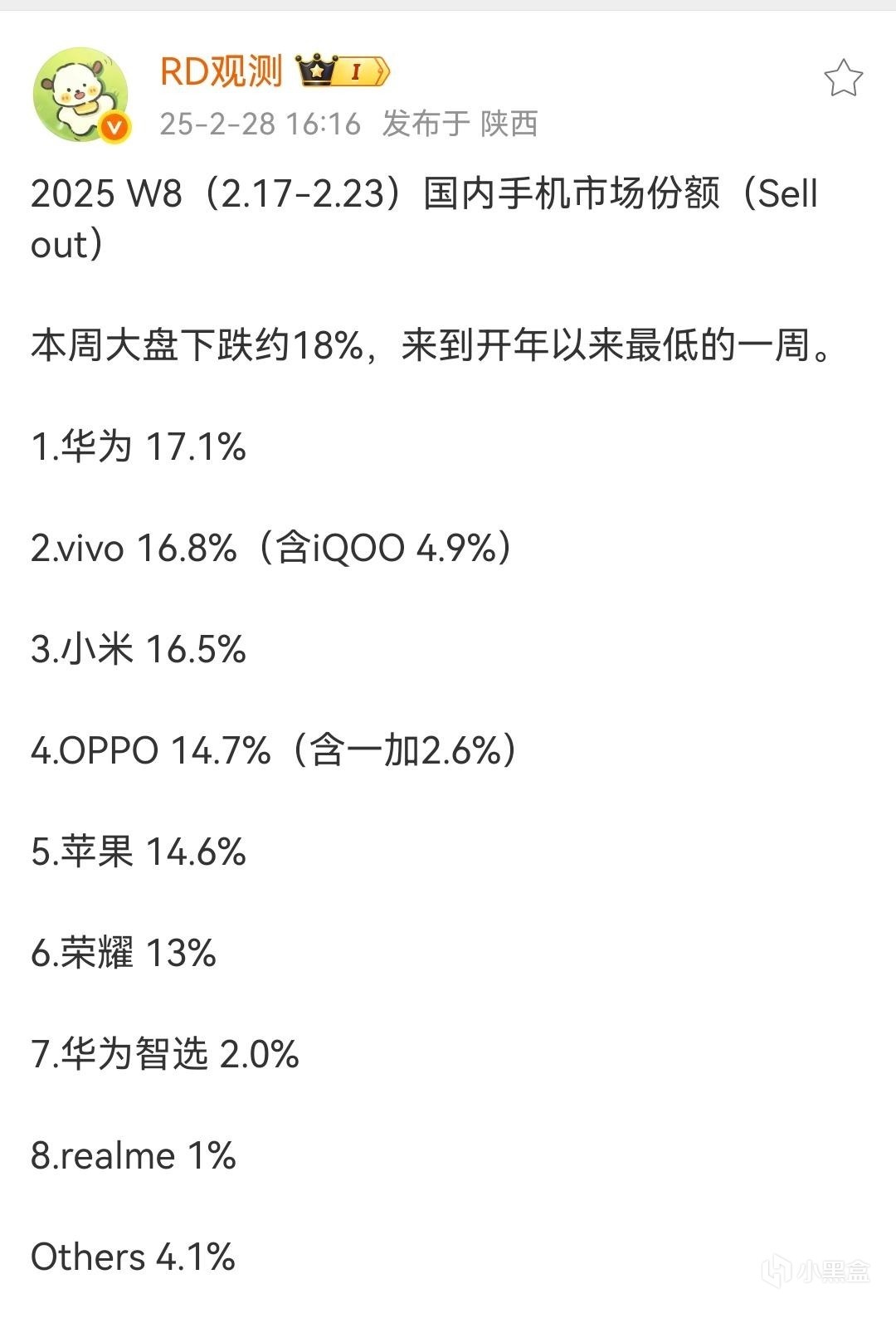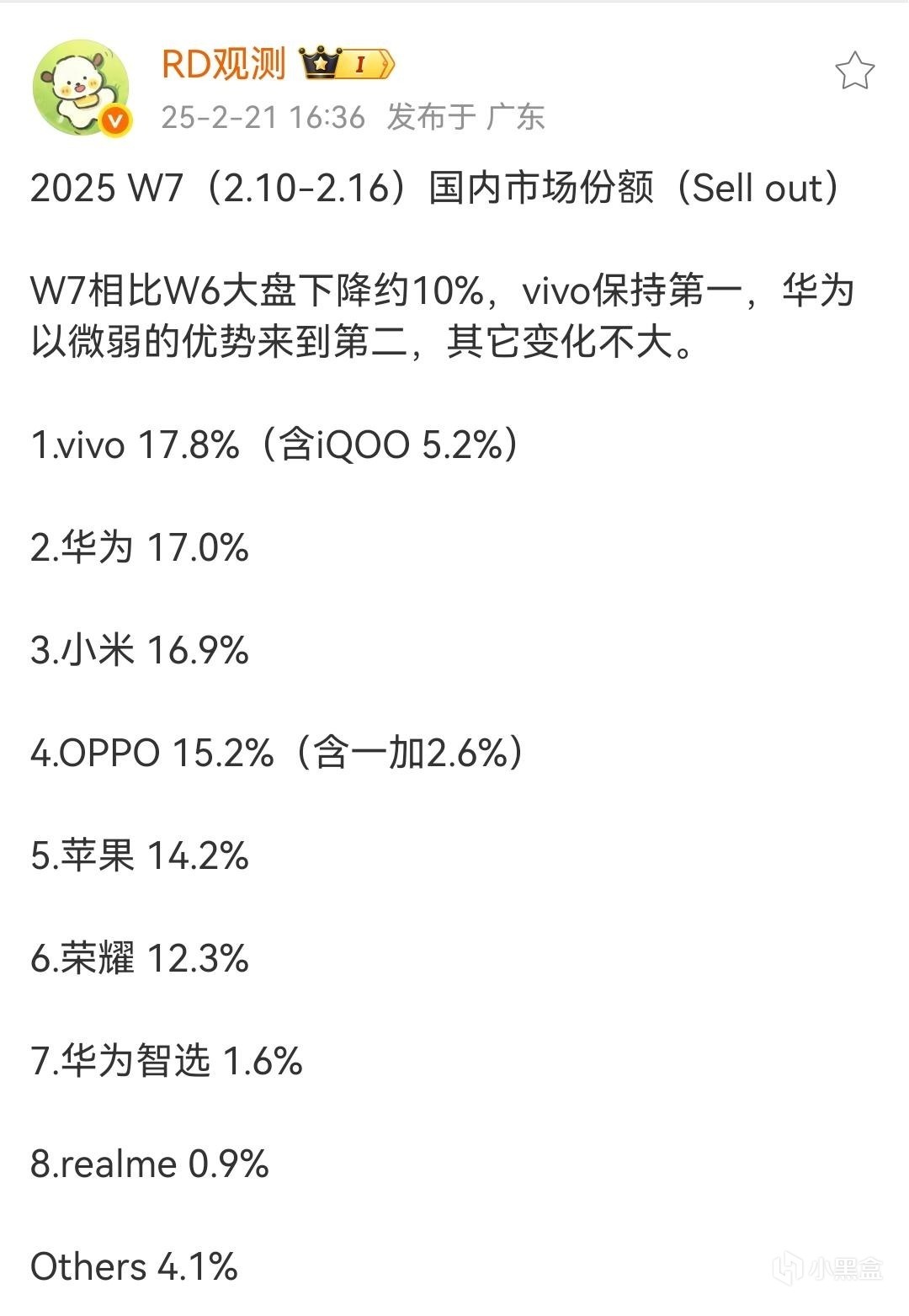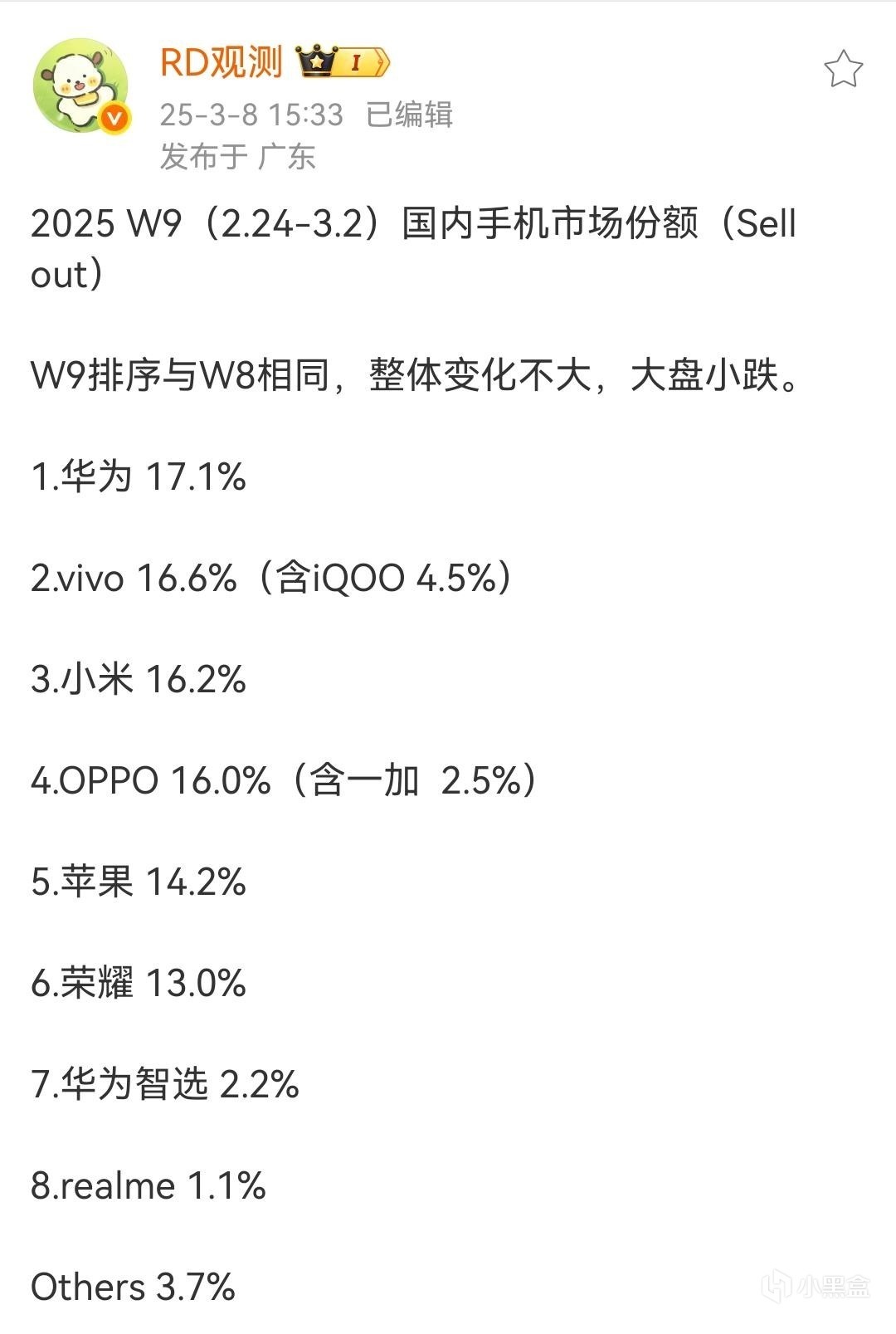 2025年1月20日手機國補正式開始,在國補的刺激下,各大品牌的銷量普遍大漲,部分機型甚至出現翻倍增長。如今國補已上線50天,國補效應正在逐漸減弱,手機消費迴歸理性,各品牌在國內的市場份額排名也迴歸正常。國補退潮後,華爲的優勢再次凸顯,W8和W9連續2周穩居國內第一,市場份額穩定在17%以上,如果加上華爲智選,市場份額之和接近20%。