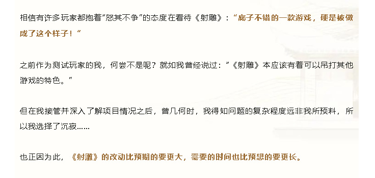 和玩家溝通時我也說過,《射鵰》這個項目整體的複雜程度遠超我的預期。因爲很多問題不光在於產品本身,而是我們過去的一些研發管線,很多工具和流程比較陳舊臃腫,需要花很多時間更新迭代,都不太適應新產品形態的開發。