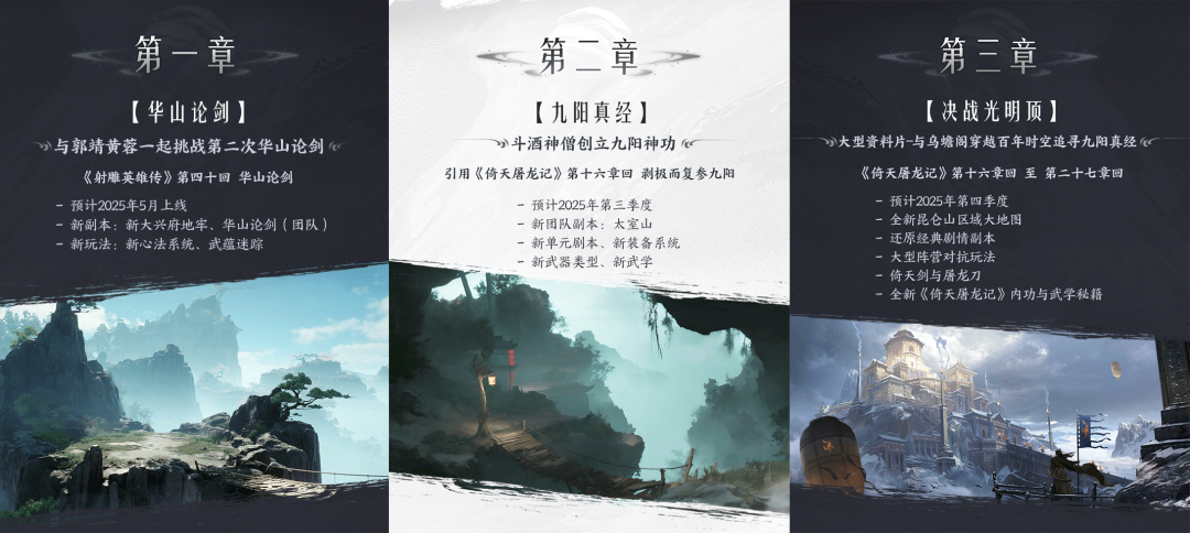 但在內容方面,我們還是希望以原著爲尺,用遊戲的方式呈現出更多經典場面。比如《射鵰》即將在2025年5月開放的華山論劍全新副本,不僅借鑑現實場景,還加入了我們的一些想法。這不光是我們2.0版本的方向,也會是未來長遠的目標。