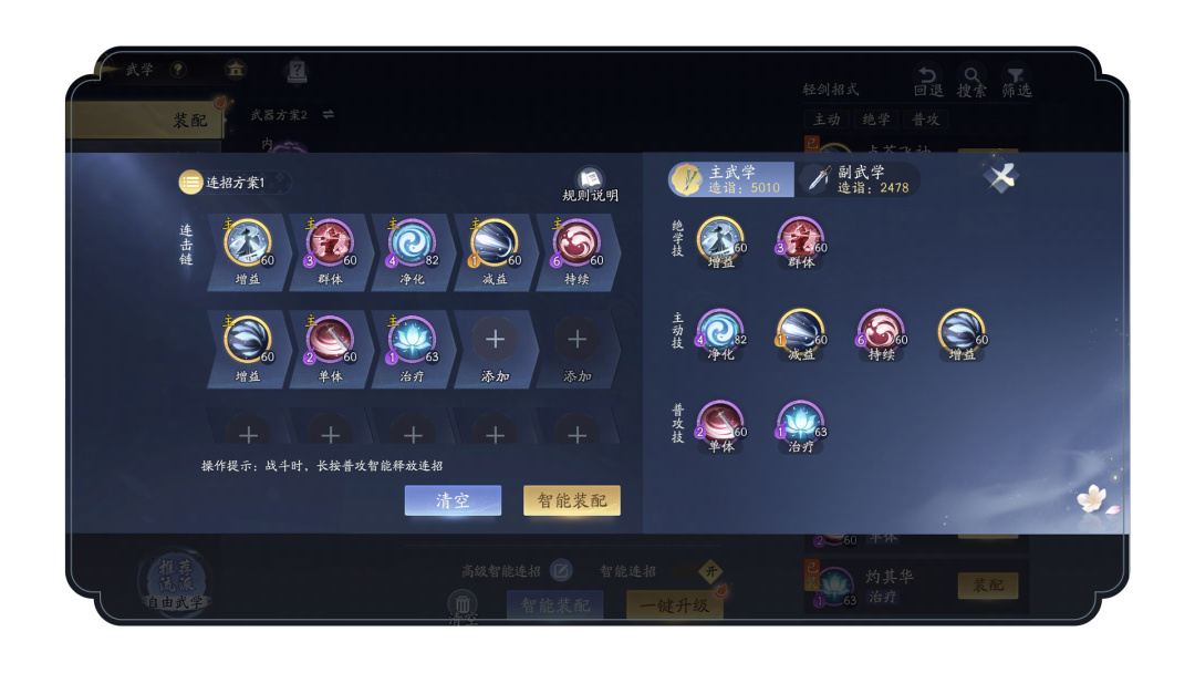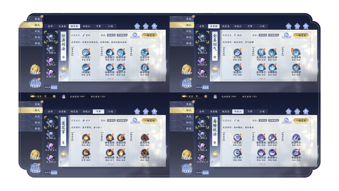 所以我們設計了一套武學進階系統,希望戰力值一般的武學招式也能得到成長。哪怕是最基礎的新手入門武學,玩家也可以選擇把它練到返璞歸真境界,一樣打出高輸出。所以結合我們的成長進階來看,其實拉平了金庸武學各招式之間的戰力差異。所有武學在最巔峯狀態時威力是一樣的。