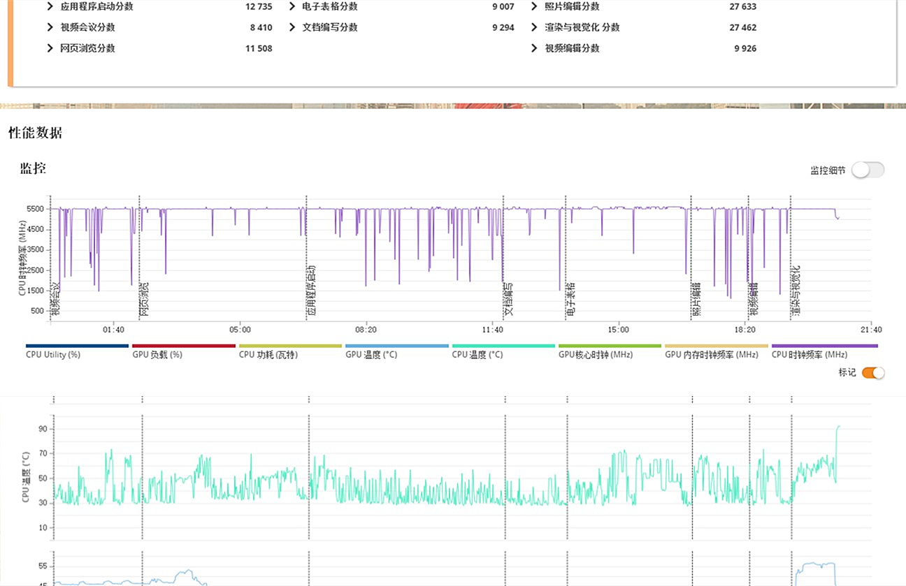 一共跑了兩次。第一次是完整項目,第二次自定義截選了圖片編輯和視頻渲染。參考CPU溫度曲線圖顯示:只有視頻渲染項目達到最高的溫度92℃,它屬於一個重度生產力,像這種任務通常是全核心滿載睿頻,即使水冷也得95度左右。再看其它場景在30~70℃區間範圍,圖片、視頻編輯中高型生產力偶爾觸及70℃,更多是在50℃上下。