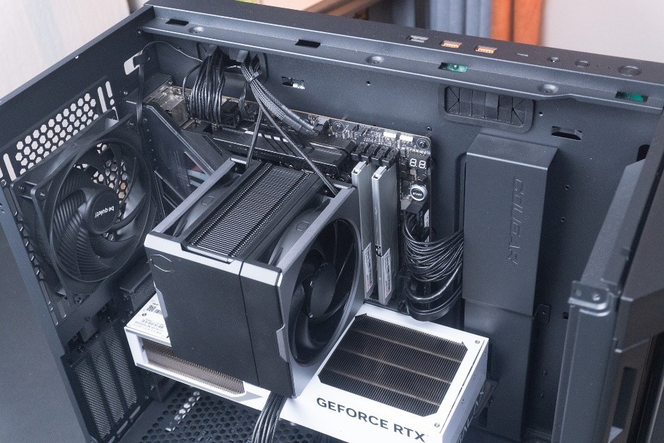 如果是以往30、40系比較大的3風扇線卡,都會卡在末尾的風扇的中間,那麼就衝突了。其實這張5070Ti不用顯卡支架我感覺也沒有下墜哈。SFF顯卡就是好。