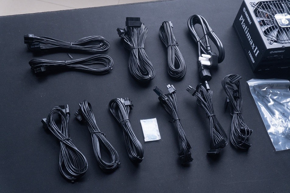 電源線:2根CPU供電(8pin),3根PCIe供電(8pin),1根主板供電(24pin),1根顯卡供電(16pin),2根硬盤供電(sata),1根大4pin(pata)。附件:4顆螺絲,紮帶,電源輸入。
