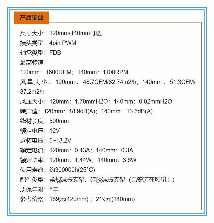 採用FDB軸承,新一代更好的三相六級電機,轉矩平滑、噪聲低、運行穩定。特別是在加入了變頻器後,能夠讓電機只需要非常低的功耗,單風扇的功耗約爲1.5W。25℃常溫30萬小時壽命(即:日均10小時 x 80年)。
